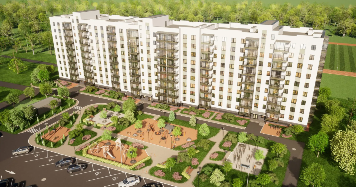 На прибудинковій території планують розмістити дитячий майданчик, зелену зону для відпочинку та автостоянку.